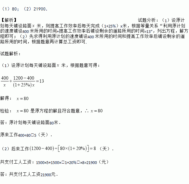 (1)80;(2)21900. 【解析】试题分析:(1)设原计划每天铺设路面米,则提高工作效率后每天完成(1+25%)x米,根据等量关系“利用原计划的速度铺设400 米所用的时间+提高工作效率后铺设剩余的道路所用的时间=13”,列出方程,解方程即可;(2)先求得利用原计划的速度铺设400 米所用的时间和提高工作效率后铺设剩余的道路所用的时间,根据题意再计算总工资即可. 试题解析: ...