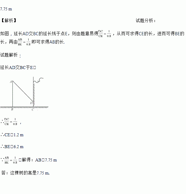 一位同学想利用树影测量树高,他在某一时刻测得长为1m 的竹竿(与水平面垂直) 影长0.8m,但当他马上测量树影时,因树靠近一幢建筑物,影子不全落在地面上,有一部分影子在墙上,如图所示,他先测得留在墙上的影高CD 为1.5 m,又测得地面部分的影长BC为5m,请算一下这棵树AB的高是多少?