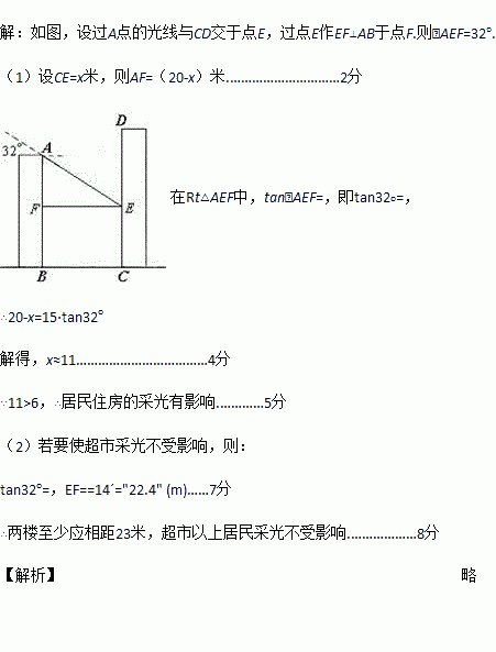 某住宅小区有一正南朝向的居民楼,如下图,该居民楼的一楼是高6m的小区超市,超市以上是居民住房.在该楼前方15m处准备盖一幢高20m的新楼.已知当地冬季正午的阳光与水平线夹角为32°.