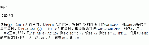 如图,矩形ABCD中,AB=6,BC=8,点E是BC边上一点,连接AE,把∠B沿AE折叠,使点B落在点B′处。当△CEB′为直角三角形时,BE的长为___.