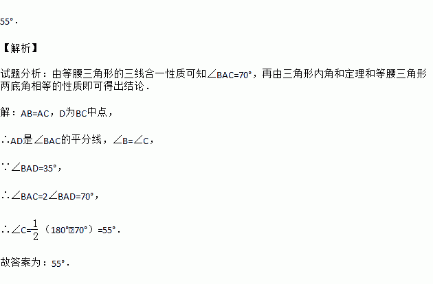 如图,在△ABC中,AB=AC,D为BC中点,∠BAD=35°,则∠C的度数为 .