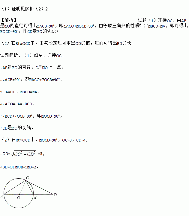 如图,AB是⊙O的直径,C是⊙O上一点,D在AB的延长线上,且∠BCD=∠A.
