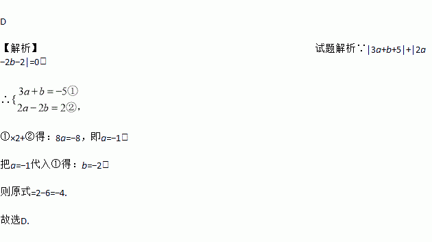 D 【解析】试题解析∵|3a+b+5|+|2a?2b?2|=0, ∴ ①×2+②得:8a=?8,即a=?1, 把a=?1代入①得:b=?2, 则原式=2?6=?4. 故选D.