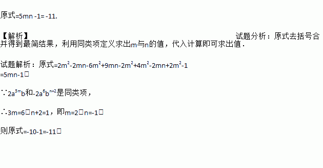 原式=5mn -1= -11. 【解析】试题分析:原式去括号合并得到最简结果,利用同类项定义求出m与n的值,代入计算即可求出值. 试题解析:原式=2m2-2mn-6m2+9mn-2m2+4m2-2mn+2m2-1 =5mn-1, ∵2a3mb和-2a6bn+2是同类项, ∴3m=6,n+2=1,即m=2,n=-1, 则原式=-10-1=-11.