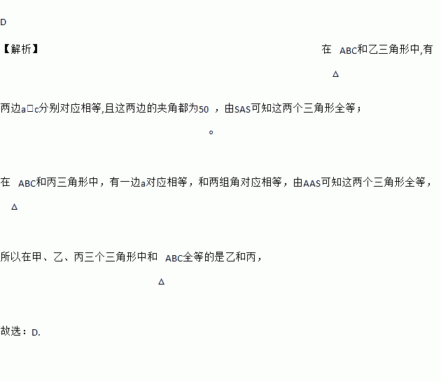 D 【解析】在△ABC和乙三角形中,有两边a、c分别对应相等,且这两边的夹角都为50?,由SAS可知这两个三角形全等; 在△ABC和丙三角形中,有一边a对应相等,和两组角对应相等,由AAS可知这两个三角形全等, 所以在甲、乙、丙三个三角形中和△ABC全等的是乙和丙, 故选:D.
