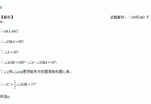 如图,AB与⊙O相切于点B,AO的延长线交⊙O于点C,联结BC,若∠A=36°,则∠C等于( )