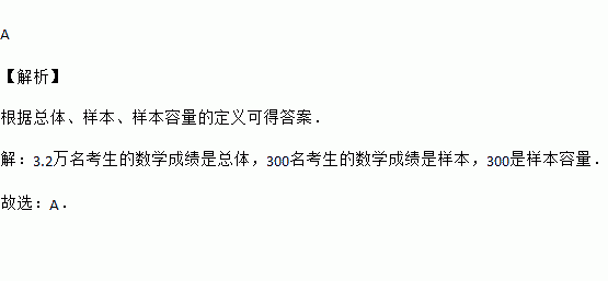A 【解析】 根据总体、样本、样本容量的定义可得答案. 【解析】 3.2万名考生的数学成绩是总体,300名考生的数学成绩是样本,300是样本容量. 故选:A.