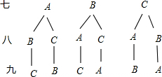 “学雷锋活动日”这天,阳光中学安排七、八、九年级部分学生代表走出校园参与活动,活动内容有:A.打扫街道卫生;B.慰问孤寡老人;C.到社区进行义务文艺演出.学校要求一个年级的学生代表只负责一项活动内容.