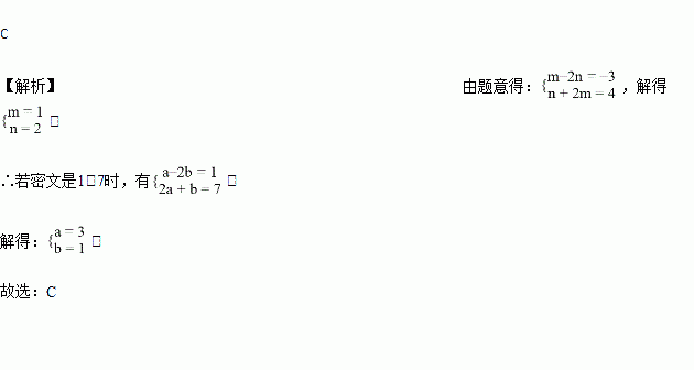 已知密文和明文的对应规则为:明文a、b对应的密文为ma-nb、na+mb.例如,明文1、2对应的密文是-3,4.若密文是1,7时,则对应的明文是( )