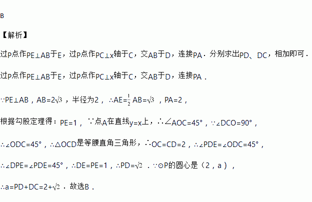 如图,在平面直角坐标系中,⊙ P的圆心坐标是(2,a)(a>2),半径为2,函数y=x的图象被⊙ P截得的弦AB的长为,则a的值是 ( )