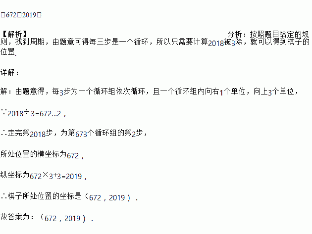 在平面直角坐标系中,智多星做走棋的游戏,其走法是:棋子从原点出发,第1步向上走1个单位,第2步向上走2个单位,第3步向右走1个单位,第4步向上走1个单位……依此类推,第n步的走法是:当n被3除,余数为2时,则向上走2个单位;当走完第2018步时,棋子所处位置的坐标是_____