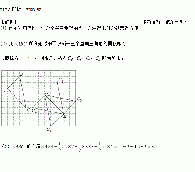 (1)试在DE一侧找出格点C,使得以D,E,C为顶点的三角形与△ABC全等;