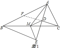 分析 (1)延长CD交AB于点F,先证明△ADF≌△ADC,得出AC=AF,CD=DF,再证明MD是△CBF的中位线,得出DM=$\frac{1}{2}$BF=$\frac{1}{2}$(AB-AF),即可得出结果;