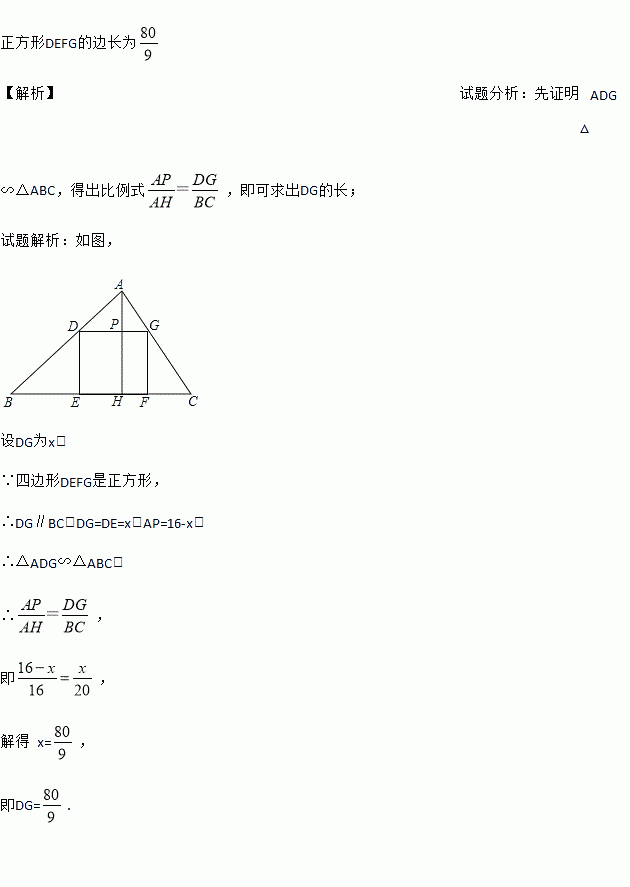 在“三爱三节”活动中,小明准备从一张废弃的三角形铁片上剪出一个正方形做一个圆柱侧面.如图,四边形DEFG是△ABC的内接正方形,D、G分别在AB、AC上,E、F在BC上,AH是△ABC的高,已知BC=20,AH=16,求正方形DEFG的边长.