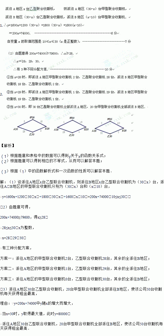 (2)若使农机租赁公司这50台联合收割机一天获得的租金总额不低于79 600元,说明有多少种分配方案,并将各种方案设计出来;