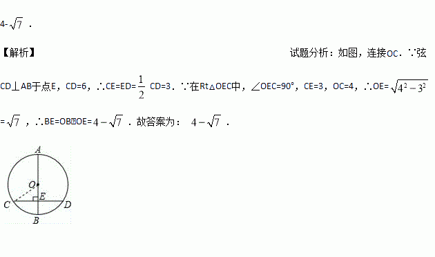 如图,AB是⊙O的直径,弦CD⊥AB于点E,若AB=8,CD=6,则BE=_________.