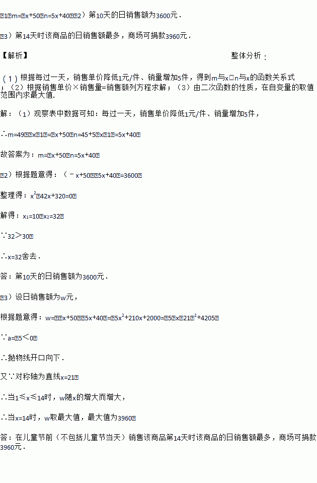 (3)销售商品的第15天为儿童节,请问:在儿童节前(不包括儿童节当天)销售该商品第几天时该商品的日销售额最多?商场决定将这天该商品的日销售额捐献给儿童福利院,试求出商场可捐款多少元?