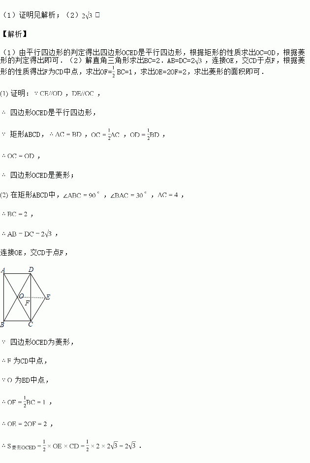 (2)若∠BAC=30°,AC=4,求菱形OCED的面积.