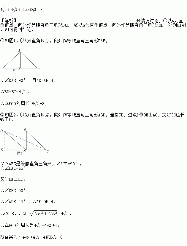 在△ABC中,∠BAC=90°,AB=AC=4,在△ABC的外部,以AB为直角边作等腰直角△ABD,连接CD,则△BCD的周长为_____________.