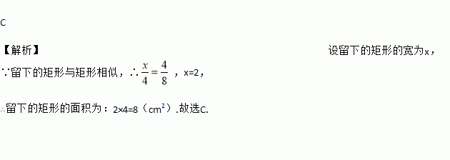 C 【解析】设留下的矩形的宽为x,∵留下的矩形与矩形相似,∴,x=2, ∴留下的矩形的面积为:2×4=8(cm2).故选C.