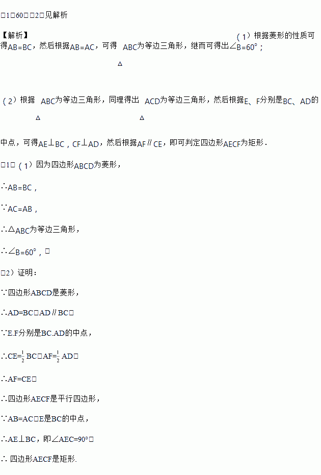 如图,已知菱形ABCD,AB=AC,E、F分别是BC、AD的中点,连接AE、CF