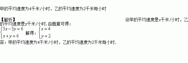 (7分)列方程组解应用题:甲、乙二人相距6km,二人同向而行,甲3小时可追上乙;相向而行,1小时相遇。二人的平均速度各是多少?