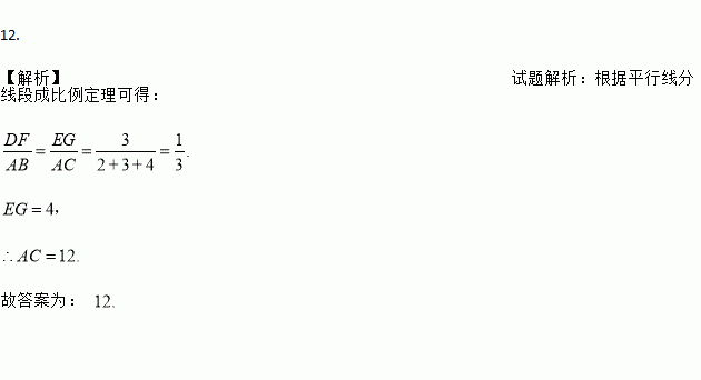 如图,DE//FG//BC,AD∶DF∶FB=2∶3∶4,如果EG=4,那么AC=______.