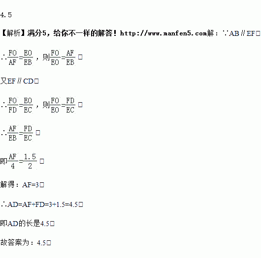 如图,已知AD、BC相交于点O,AB∥CD∥EF,如果CE=2,EB=4,FD=1.5,那么AD=________.