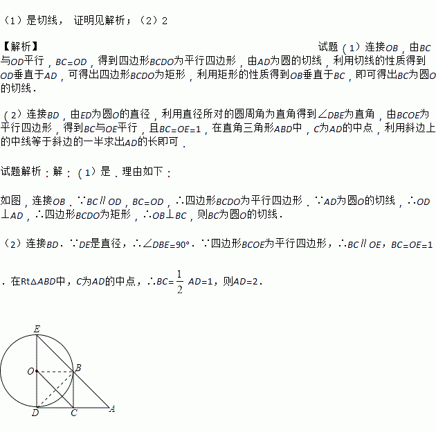 如图,DE是⊙O的直径,过点D作⊙O的切线AD,C是AD的中点,AE交⊙O于点B,且四边形BCOE是平行四边形。