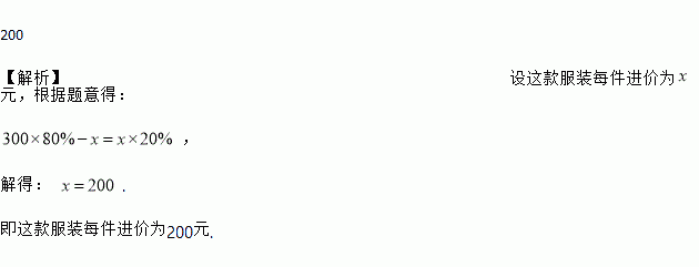200 【解析】设这款服装每件进价为元,根据题意得: , 解得: . 即这款服装每件进价为200元.