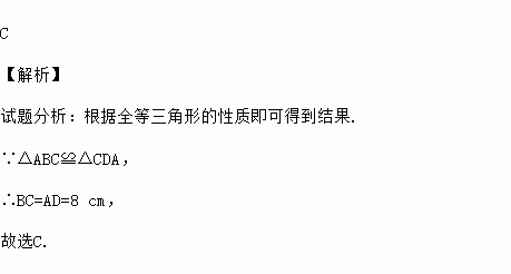 如图所示,△ABC≌△CDA,AC=7 cm,AB=5 cm,BC=8 cm,则AD的长是( )