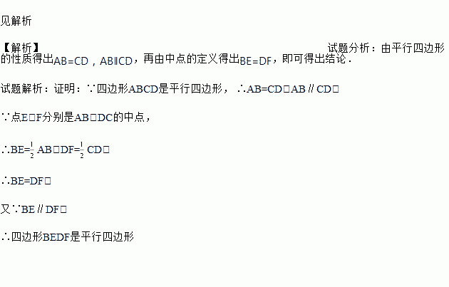 已知:如图.在平行四边形ABCD中,点E、F分别是AB、DC的中点.求证:四边形BEDF是平行四边形.