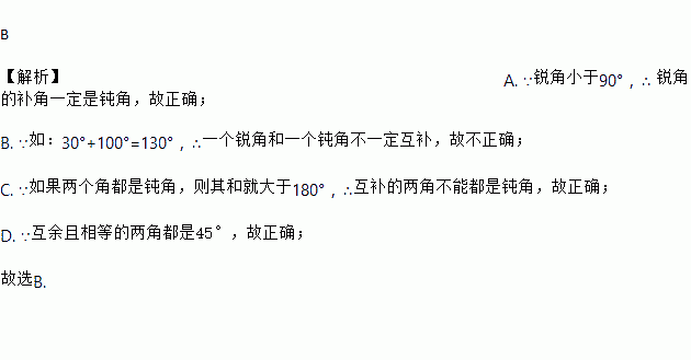 C. 互补的两角不能都是钝角 D. 互余且相等的两角都是45°