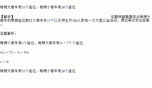 某校计划组织师生共300人参加一次大型公益活动,如果利用6辆大客车和5辆小客车恰好全部坐满.已知每辆大客车的乘客座位数比小客车多17个,求每辆大客车和每辆小客车的乘客座位数.