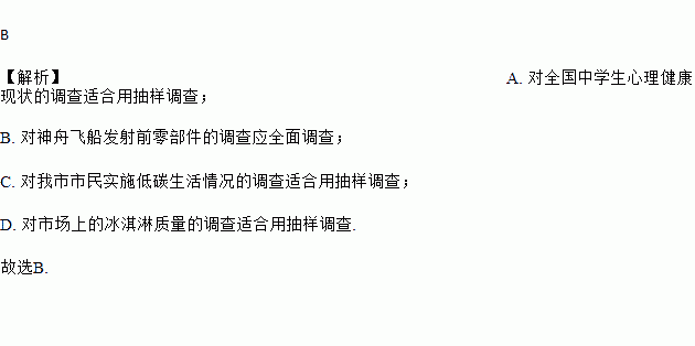 A. 对全国中学生心理健康现状的调查 B. 对神舟飞船发射前零部件的调查