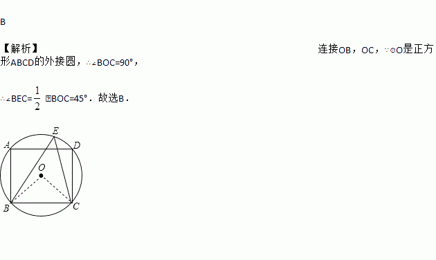 如图,已知⊙O是正方形ABCD的外接圆,点E是弧AD上任意一点,则∠BEC的度数为( )