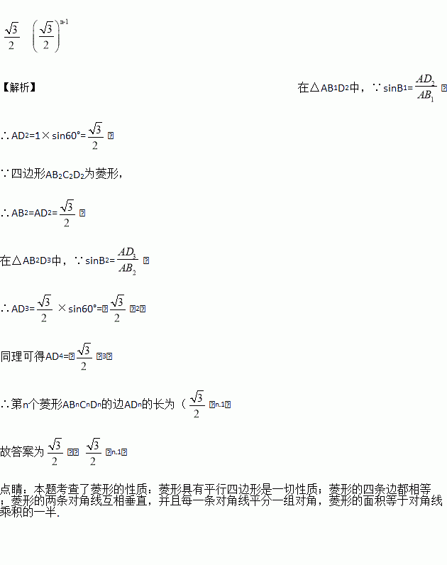 如图,菱形AB1C1D1的边长为1,∠B1=60°;作AD2⊥B1C1于点D2,以AD2为一边,做第二个菱形AB2C2D2,使∠B2=60°;作AD3⊥B2C2于点D3,以AD3为一边做第三个菱形AB3C3D3,使∠B3=60°…则AD2=_____,依此类推这样做的第n个菱形ABnCnDn的边ADn的长是_____.