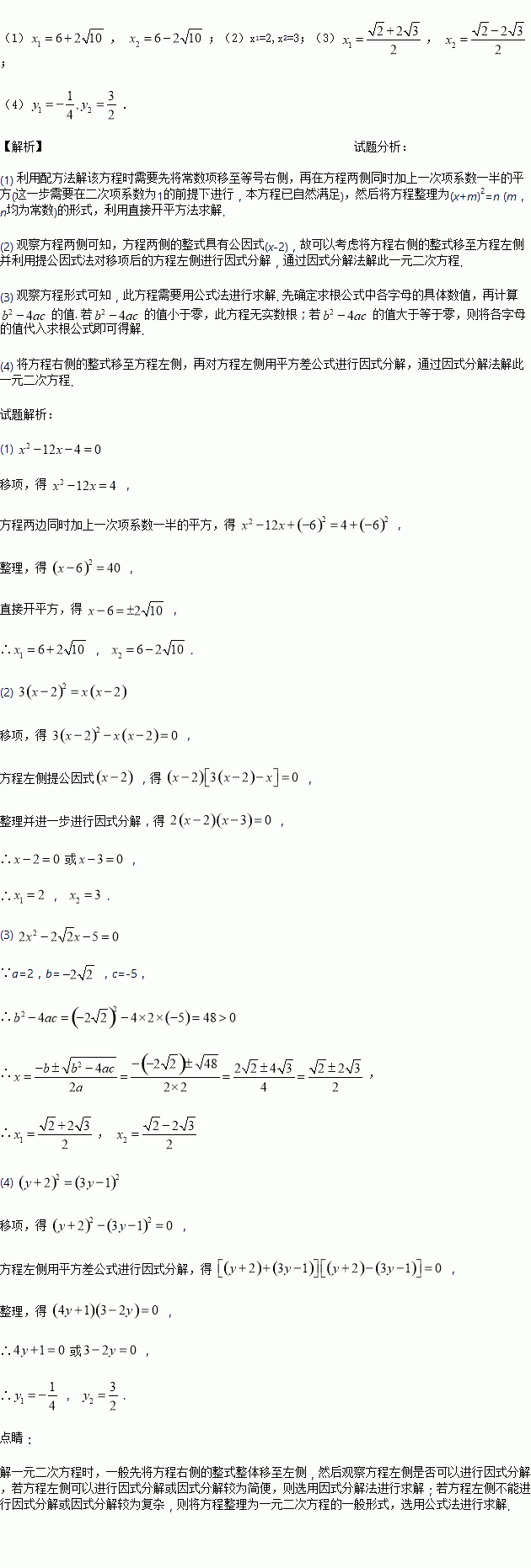 (1)(用配方法) (2)