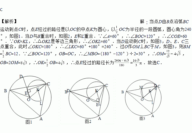 如图,△ABC为⊙O的内接三角形,BC=24 , ,点D为弧BC上一动点,CE垂直直线OD于点E, 当点D由B点沿弧BC运动到点C时,点E经过的路径长为( )