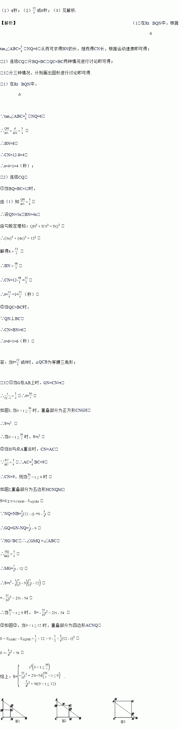 ,BC=12cm,点N从点C出发沿CB方向以1cm/s的速度运动,点N到达点B时停止运动,以CN为边在BC的上方作正方形CNGH,正方形CNGH的边NG所在直线与线段AB交于点Q,设运动时间为t(s).