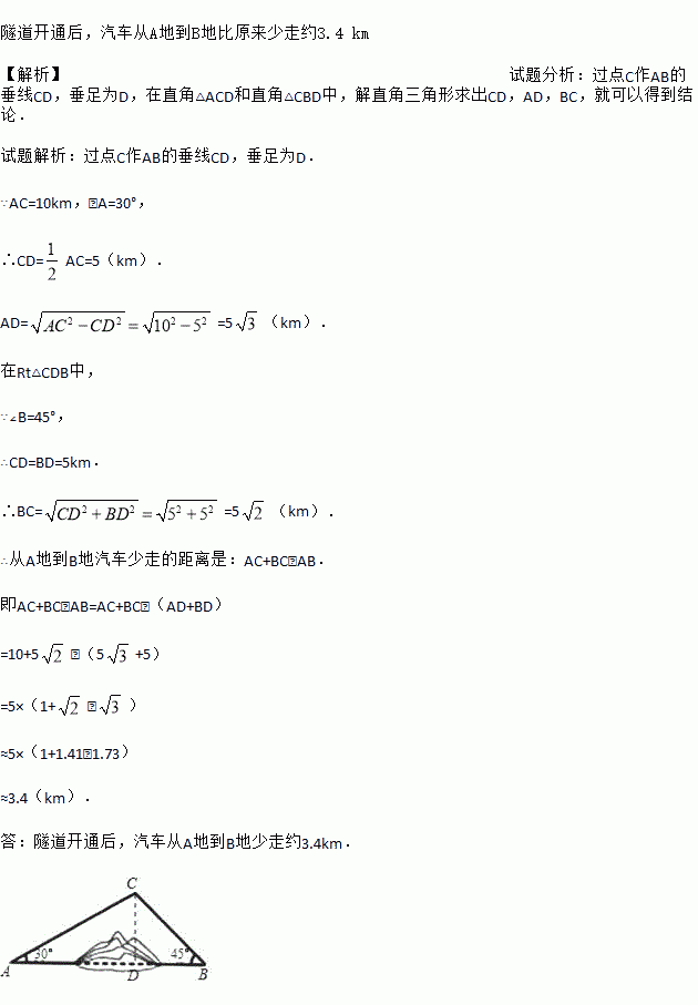 如图所示,A,B两地之间有一座山,汽车原来从A地到B地需要经C地沿折线A—C—B行驶,现开通隧道后,汽车直接沿直线AB行驶.已知AC=10 km,∠A=30°,∠B=45°,则隧道开通后,汽车从A地到B地比原来少走多少千米?(结果精确到0.1 km,参考数据: