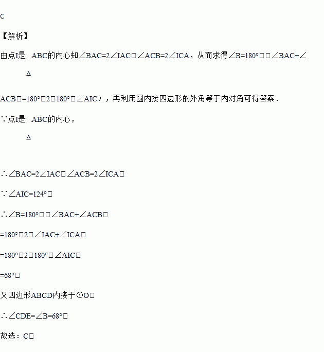如图,四边形ABCD内接于⊙O,点I是△ABC的内心,∠AIC=124°,点E在AD的延长线上,则∠CDE的度数为( )
