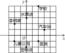 分析:根据汽车站的坐标是(3,1),可以得到原点位置,从而确定儿童公园和学校以及宠物店的位置.