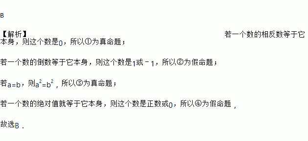 B 【解析】若一个数的相反数等于它本身,则这个数是0,所以①为真命题; 若一个数的倒数等于它本身,则这个数是1或﹣1,所以②为假命题; 若a=b,则a2=b2,所以③为真命题; 若一个数的绝对值就等于它本身,则这个数是正数或0,所以④为假命题, 故选B.