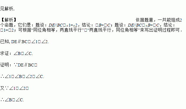 如图所示,在①DE∥BC;②∠1=∠2;③∠B=∠C三个条件中,任选两个作题设,另一个作为结论,组成一个命题,并证明.