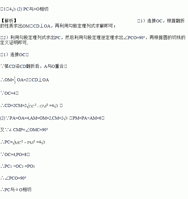如图,已知⊙O的半径为4,OA为半径,CD为弦,OA与CD交于点M,将弧CD沿着CD翻折后,点A与圆心O重合,延长OA至P,使AP=OA,连接PC.
