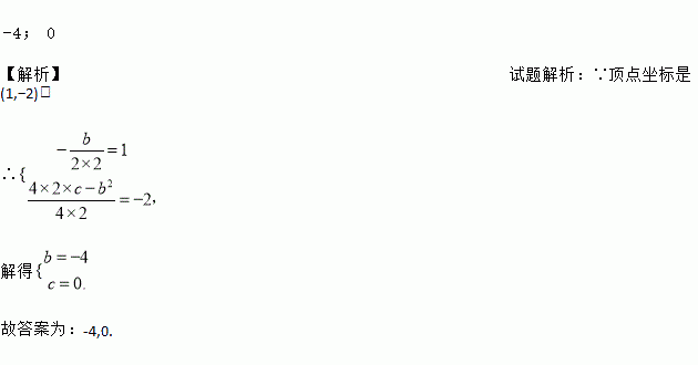 二次函数y=2x2+bx+c的顶点坐标是(1,﹣2),则b=________,c=________.