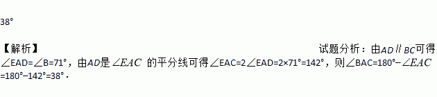如图,已知∠CAE是△ABC的外角,AD∥BC,且AD是∠EAC的平分线,若∠B=71°,则∠BAC的大小是________.