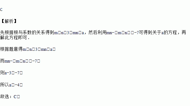 已知m,n是关于x的一元二次方程x2-3x+a=0的两个解,若mn-(m+n)=-7,则a的值为 ( )