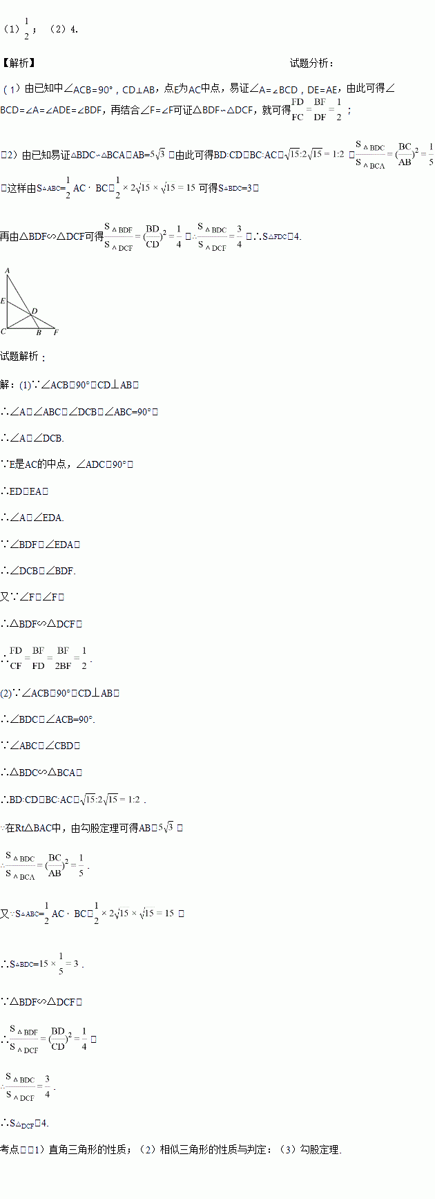 如图,在△ABC中,∠ACB=90°,CD⊥AB,垂足为D,E是AC的中点,ED的延长线与CB的延长线交于点F.